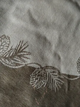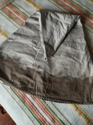 Saia de camilha com uma barra em tom marrom claro. O tecido apresenta um padrão de pinhas e ramos. Diâmetro 1,78, algodão - Barra com padrão de pinhas e ramos. - Cor principal: bege. - Cor da barra: marrom claro.