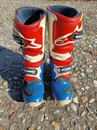 Botas de motocross Alpinestar em cores vibrantes. - Design em vermelho, branco, azul e preto. - Fechos ajustáveis para um ajuste seguro. - Cano alto para proteção. - Sola robusta para aderência.