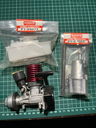 Motor Kyosho gx15 novo e completo, junto com deposito combustível (ainda embalado) e escape (ainda embalado). Este motor veio em fascículos para equipar o Ferrari F2004 Kyosho 1/8 nitro da De Agostini em 2004. Apenas montado. Nunca ligado.