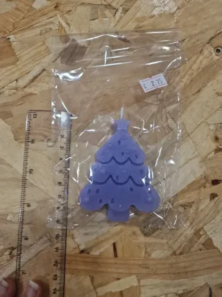 Vela em formato de pinheiro, com um design decorativo. - Cor: Roxo - Material: cera