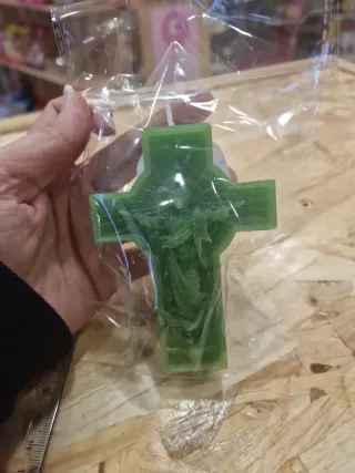 Vela decorativa em formato de crucifixo. - Design detalhado com figura. - Cor verde vibrante.
