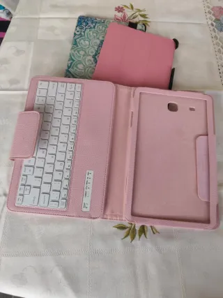 Capa protetora em couro sintético rosa para Samsung Galaxy Tab E, com teclado integrado. - Muito pouco usada - Praticamente sem marcas de uso - Design elegante e funcional. - Proteção contra arranhões e poeira. - Teclado QWERTY em branco destacável Oferta de 2 capas usadas com os seus defeitos