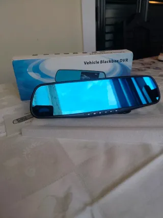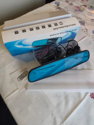Espelho retrovisor com função de gravação para veículos. Possui um design moderno e discreto. - Tela azul. - Botões de controle na parte inferior. - Câmara dianteira e traseira - Alimentado por cabo ligado ao isqueiro - Slot para cartão SD até 32Gb