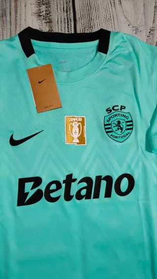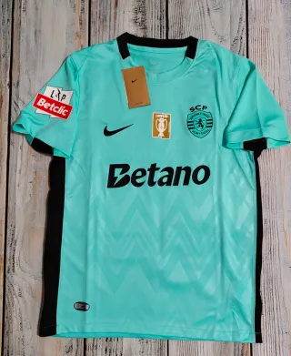 Camisola oficial do Sporting Clube de Portugal da époc 2025/2026, com o patrocinador Betano. 📏 Tamanho:M - Cor principal verde-água. - Detalhes em preto nas mangas e gola. - Escudo do clube bordado. - Logo da Nike. - Patch de campeão.