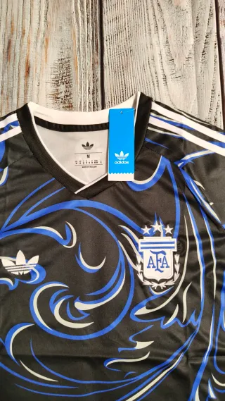 Camisola da Argentina com um design floral único em preto e azul. Tamanho: M - Logo da Adidas e escudo da AFA bordados. - Padrão floral em azul e branco. - Mangas com as icónicas três riscas da Adidas.