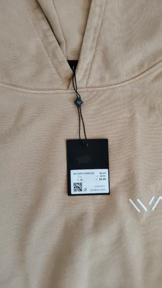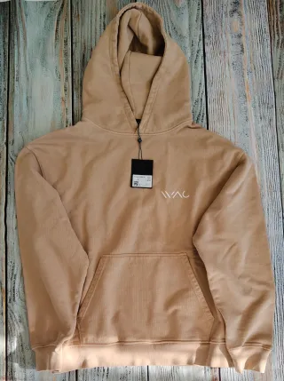 Camisola com capuz em tom bege, com um pequeno logo branco na frente. - Gola com cordão ajustável. - Bolso frontal tipo canguru. - Mangas compridas com punhos. - Bainha canelada.