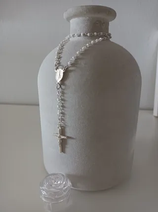 Terço infantil com contas em tons de branco e rosa. Uma peça delicada para os mais novos. - Contas em branco e rosa. - Medalha central. - Cruz com imagem de Jesus Cristo. -Novo. Nunca foi usado.