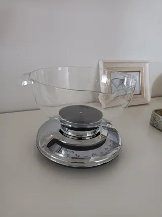 Balança de cozinha analógica com um design elegante. - Base em cromado. - Taça transparente. - Medidas em kg e g. -Novo. Nunca foi usado.
