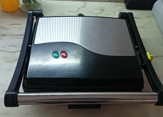Sanduicheira e grelhador em preto e prateado. - Indicadores luminosos (verde e vermelho). - Alça frontal em metal. - Trava de segurança amarela. Placas Antiaderentes: Facilitam a limpeza e a remoção dos alimentos. Aquecimento Rápido: Economiza tempo no preparo das refeições. Luzes Indicadoras: Possui luzes que indicam quando o aparelho está ligado (vermelho) e pronto a usar (verde). Design Compacto: O seu formato e, muitas vezes, a possibilidade de armazenamento vertical, otimizam o espaço na cozinha. Bandejas de Gotejamento: Alguns modelos incluem bandejas integradas para recolher gordura, facilitando uma confeção mais limpa.