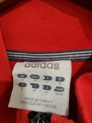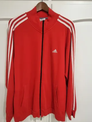 Casaco desportivo clássico da Adidas em vermelho. - Fecho completo frontal. - Gola alta. - Bolsos laterais. - As icónicas três riscas nas mangas.