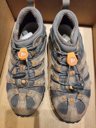 Sapatos Merrell unissexo em tons de castanho e cinza. - Design desportivo. - Fecho rápido. - Sola robusta.