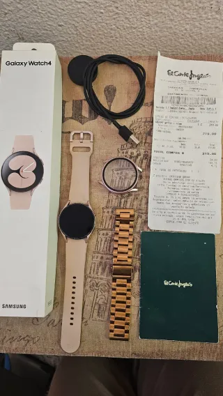Relógio inteligente Samsung Galaxy Watch 4. - 40mm/LTE - corpo elegante e bracelete em rosa. - Inclui carregador USB. - Inclui bracelete extra em metal dourado. - Inclui moldura protetora para o ecrã. - tem fatura de compra mas não tem garantia