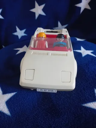 Carro Playmobil estilo Corvette de 1987 com dois bonecos. •Farois que sobem e baixam. •Cor branca. •Boneco com capacete amarelo e casaco vermelho. •Boneco com boné preto e casaco azul. •Bom para colecionadores