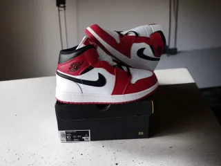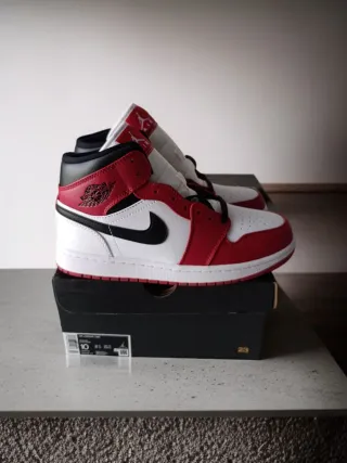 Sapatilhas Air Jordan 1 Mid - Combinação de couro branco e vermelho. - Swoosh preto lateral. - Detalhes em preto no colarinho e atacadores.