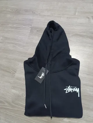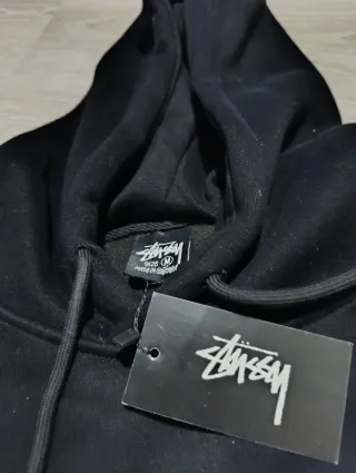 Sweatshirt Stussy preta com etiqueta. - Logo Stussy na frente. - Capuz com cordão. - Bolso frontal.