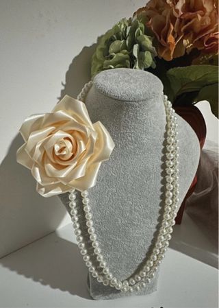 Colar elegante com pérolas e um detalhe de flor. - Pérolas de cor bege e branca. - Detalhe de flor em tecido.