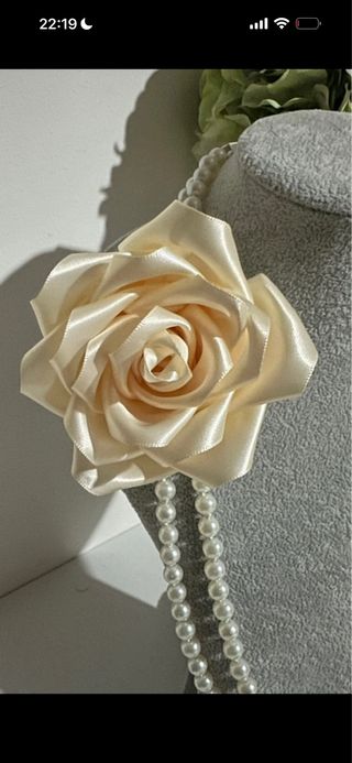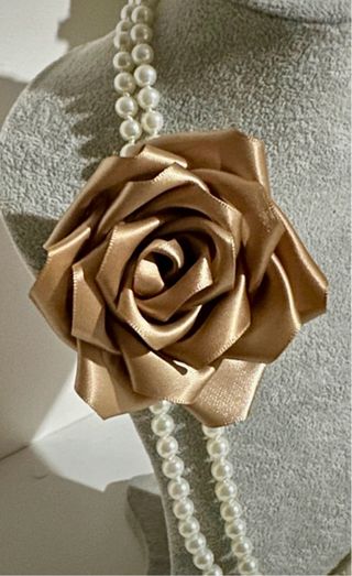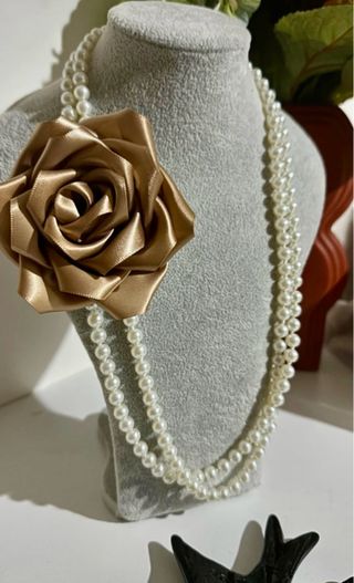 Colar elegante com uma flor em cetim dourado e duas voltas de pérolas brancas. - Flor em cetim dourado. - Duas voltas de pérolas brancas.