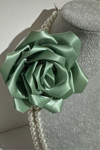 Colar elegante com uma flor verde e duas voltas de pérolas. - Flor em cetim verde. - Pérolas brancas. - Design duplo.