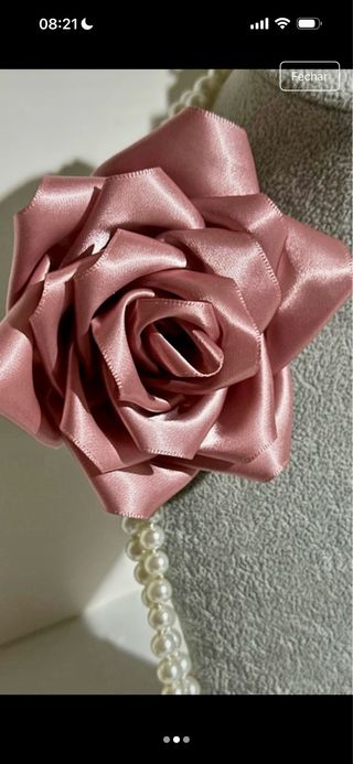 Colar elegante com uma flor rosa e duas voltas de pérolas. - Flor em cetim rosa. - Pérolas brancas. - Design duplo.