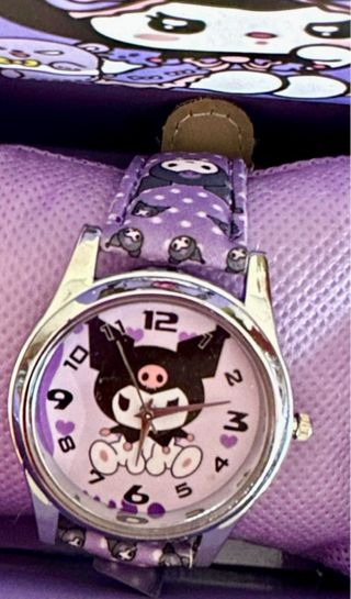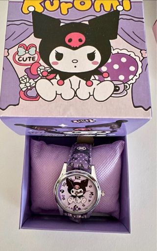 Relógio infantil com o personagem Cinnamoroll. A caixa do relógio é decorada com o personagem e ursinhos. - Pulseira com padrão de bolinhas. - Mostrador com ilustração do Cinnamoroll.