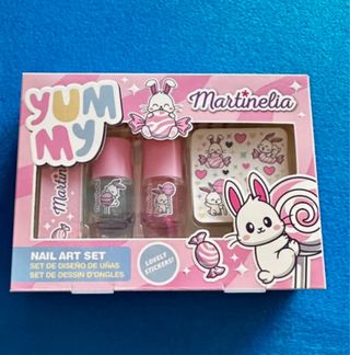 Kit de arte para unhas da Martinelia, com tema Yummy My. - Inclui dois esmaltes. - Contém uma lixa. - Adesivos temáticos de coelhinhos e doces. - Embalagem colorida e divertida.