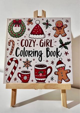 Livro de colorir com tema de Natal e Cozy Girl. - Capa com ilustrações festivas. - Desenhos de biscoitos de gengibre, chapéus de inverno, azevinho e canas de rebuçado. - Canecas de chocolate quente e uma grinalda.
