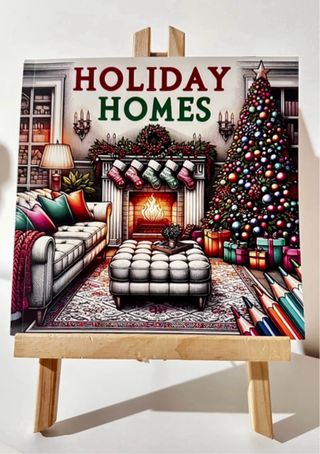 Caderno de colorir com tema Holiday Homes, perfeito para quem gosta de atividades criativas. - Capa com ilustração temática de Natal. - Design interior com cenas de Holiday Homes para pintar.