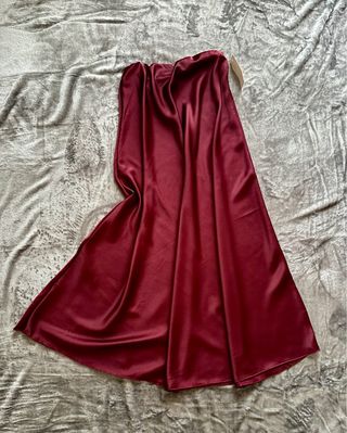 Saia de cetim elegante em bege e vermelho. Acessórios não incluídos. - Material: Cetim - Cor: Bege e Vermelho - Tamanho: Único