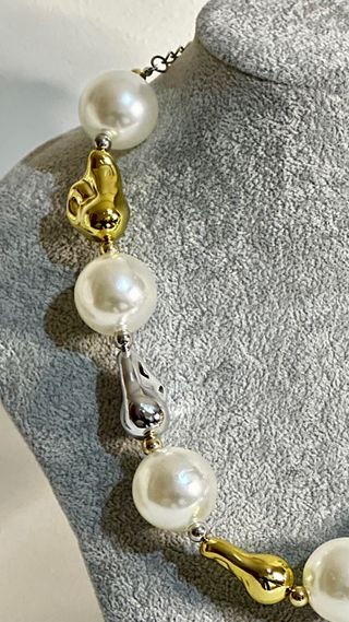 Colar elegante com pérolas grandes e detalhes metálicos. - Pérolas brancas. - Detalhes em dourado. - Detalhes em prateado.
