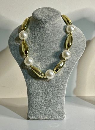 Colar elegante com pérolas grandes e detalhes dourados. - Pérolas de cor branca. - Elementos decorativos em dourado. - Design moderno e sofisticado.