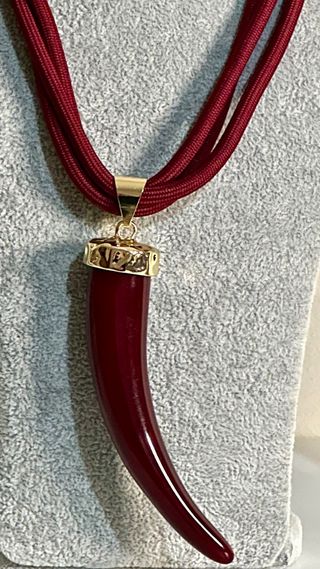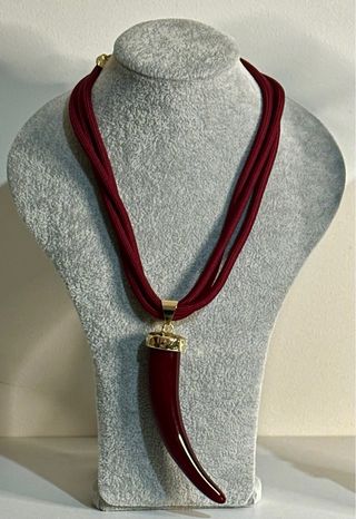 Colar com um pingente em formato de dente, com detalhes dourados. - Cordão de tecido vinho. - Pingente com acabamento dourado. - Design único e elegante.