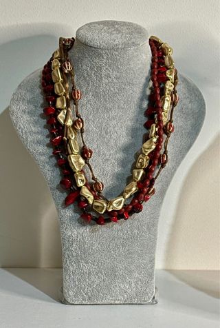 Colar vintage com um design único e elegante. - Contas em tons de dourado e vermelho. - Várias camadas para um visual impactante. - Fecho seguro e discreto.