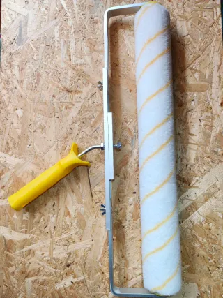 Conjunto de rolo de tinta com cabo amarelo e esquadro industrial ajustável. - Rolo de tinta branco com riscas amarelas. - Cabo de plástico amarelo. - Esquadro em metal com ajuste. 18mm rolo Ferramentas até 50 cm Tudo novo