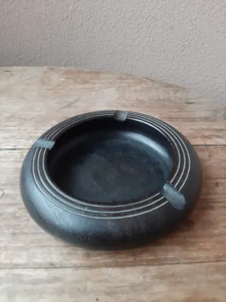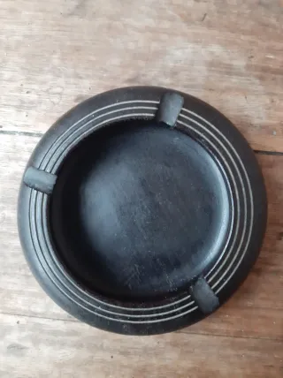 Cinzeiro de madeira com um design africano vintage. A peça apresenta um acabamento escuro e detalhes em relevo. - Material: Madeira - Estilo: Vintage Africano - Design: Esculpido com ranhuras Medidas aproximadas: ø13cm