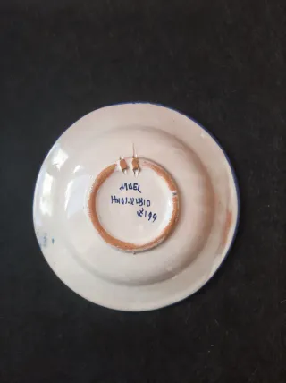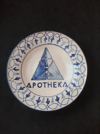 Prato decorativo de parede da marca Muel, fabricado por Hnos. Rubio. Apresenta um design pintado à mão com motivos azuis. - Motivo central com triângulo e símbolo. - Bordadura com padrão floral azul. - Escrita APOTHEKA ( Farmácia) em azul. Medidas aproximadas ø19cm
