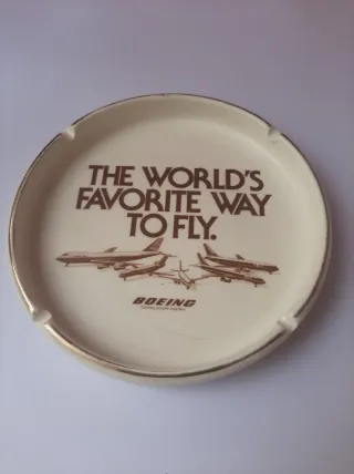 Cinzeiro vintage da Boeing, perfeito para colecionadores. - Design com aviões e slogan The World's Favorite Way to Fly. - Detalhe dourado na borda. - Logo Boeing Getting people together na base. Medidas aproximadas: ø16cm