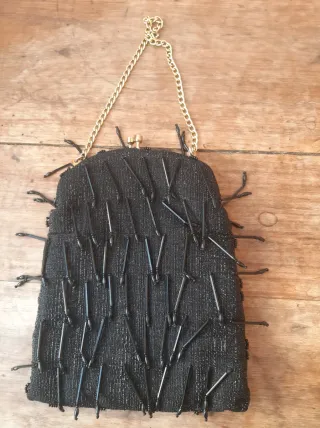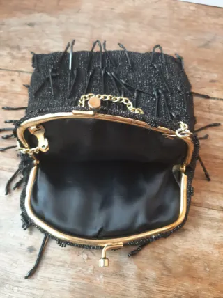Carteira de mão preta com um toque vintage e detalhes que a tornam única. Perfeita para complementar um look elegante. - Design com contas e adornos. - Alça de corrente dourada. - Fecho de metal dourado. Medidas aproximadas: 19cmx14cm