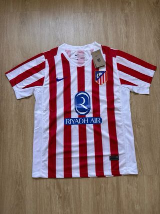 Camisola do Atlético de Madrid, com design listrado em vermelho e branco. - Logo da Nike bordado. - Escudo do clube no peito. - Patrocínio Riyadh Air na frente.