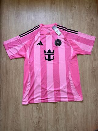 Camisola do Inter Miami da marca Adidas, com um design vibrante em tons de rosa e detalhes em preto. - Tamanho XXL. - Tecnologia Aeroready. - Escudo do clube bordado.