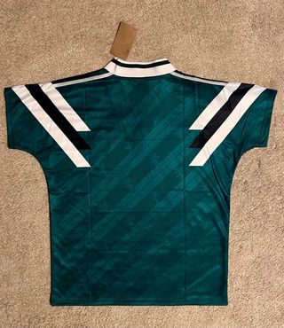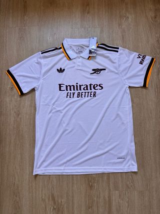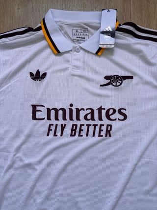 Camisola do Arsenal da marca Adidas, tamanho XL. Design moderno com detalhes em castanho e amarelo na gola. - Logo da Adidas em relevo. - Emblema do Arsenal. - Listras Adidas nas mangas.