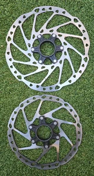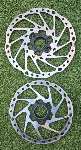 Conjunto de dois discos para bicicleta Um disco mede 160mm e o outro 180mm Marca: Shimano Disco XT-RT81S center Lock Ice Technologies - 160mm Disco XT-RT81M center lock Ice Technologies - 180mm