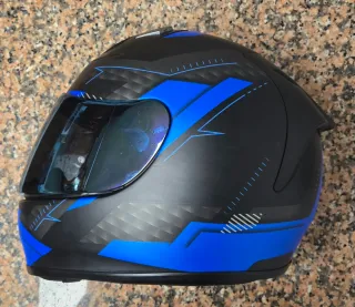 Capacete integral da marca HJC com um design moderno em azul e preto. - Design com detalhes em azul. - Acabamento em preto. - Viseira espelhada azul.