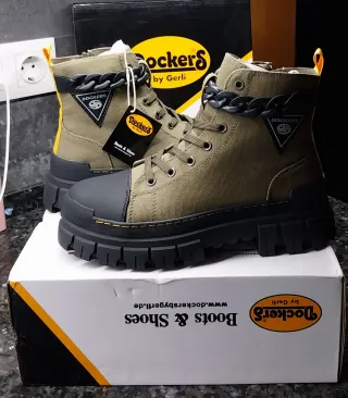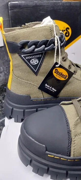 Botas estilo militar da marca Dockers by Gerli em verde tropa. Possuem um design moderno e robusto. - Detalhe de corrente preta na parte superior. - Fecho em atacadores. - Sola grossa e antiderrapante.