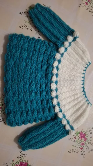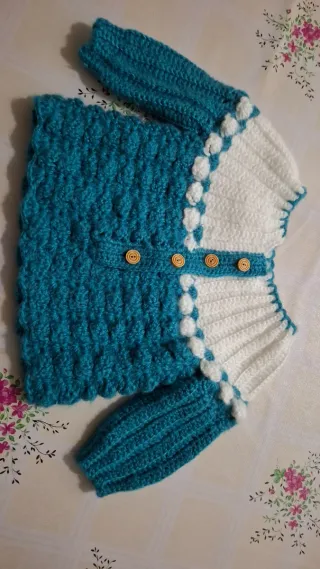 Casaco de bebé encantador, feito à mão com carinho em crochet. - Cor azul turquesa vibrante. - Detalhes em branco com acabamento ondulado. - Fecho com botões de madeira. - Mangas compridas com punhos canelados.