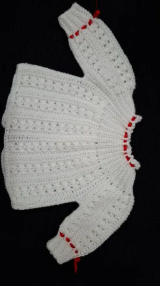 Casaco de lã branco, feito à mão com um padrão delicado e detalhes encantadores. - Feito em lã macia. - Detalhes em fita de cetim vermelha. - Pequenas aplicações de rosa e corações vermelhos.