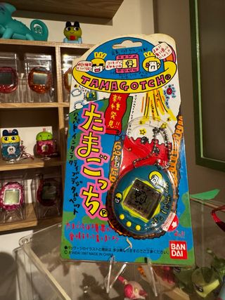 Tamagotchi original em sua embalagem de 1997. Um item colecionável para fãs. - Embalagem com design vibrante e ilustrações. - Inclui o Tamagotchi. - Fabricado pela Bandai.