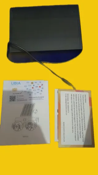 Câmara de segurança solar com Wi-Fi e visão noturna. - Alimentada por energia solar. - Design compacto e rotativo (PTZ). - Resistente à água (IP65). - Inclui manual do utilizador.