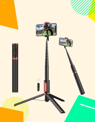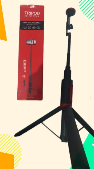 Trípode y palo selfie con conexión Bluetooth. Ideal para capturar fotos y videos. - Color: Negro y rojo. - Extensible hasta 1.5 metros. - Incluye control remoto Bluetooth.