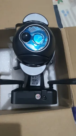 Cámara de seguridad con diseño esférico y detalles en blanco y azul. - Cuerpo principal en color negro. - Base cuadrada con dos asas laterales. - Etiqueta con código QR y texto. - Pequeña etiqueta circular rosa con texto blanco.