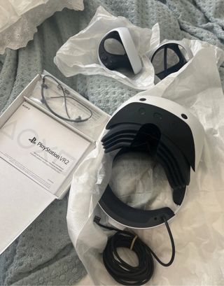 Conjunto de PlayStation VR2. - Headset VR2 - Controles Sense - Manual de instruções - Cabo USB de carregamento Comprei literalmente no mês passado mas não lhes dou uso.